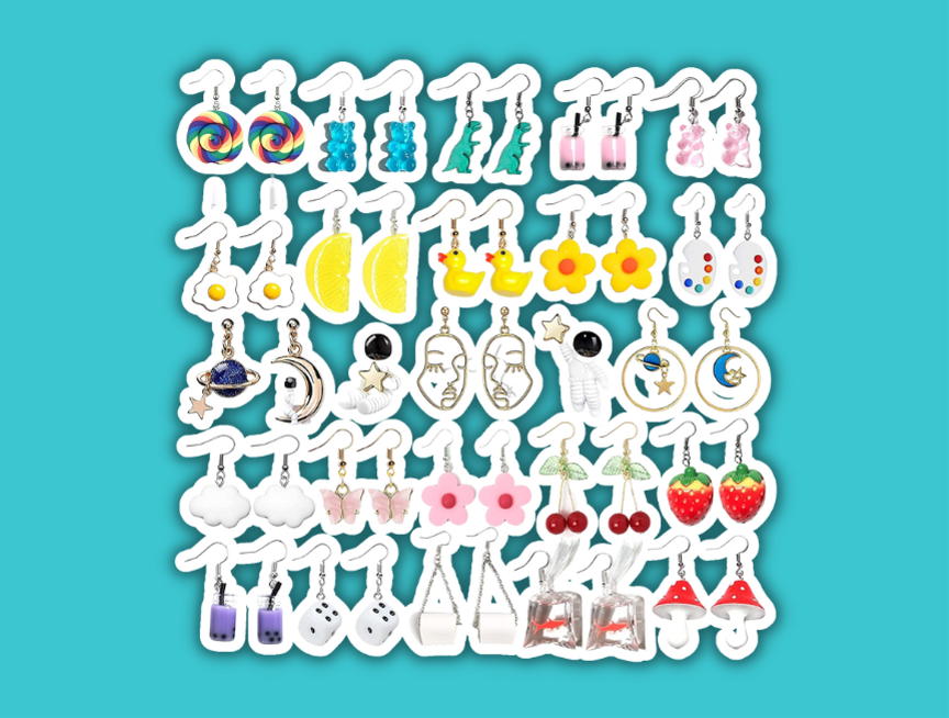 This 24 pairs earring package is outstanding value for money and a fantastic gift for tweens who adore everything quirky and cute. Some of these earrings are genuinely odd (the mini toilet rolls and goldfish in plastic bags come to mind), while others are simply cute, like the flowers and cherries. My personal favorites are the dinosaurs and the tiny boba teas!